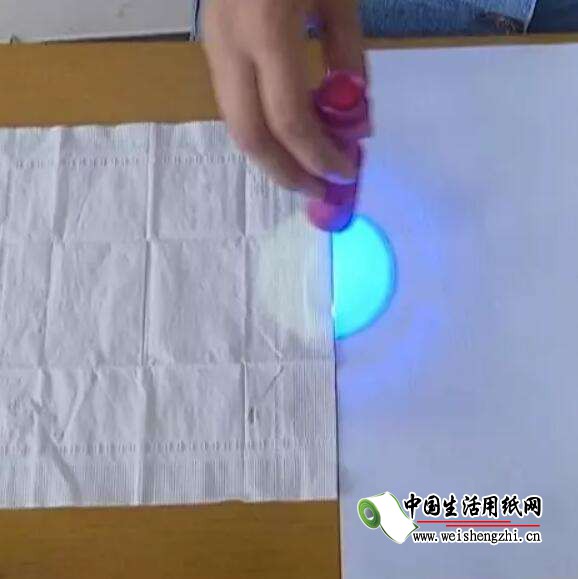 6、紫光灯鉴别,好纸灯照颜色无变化,劣质纸因为含有荧光剂,灯照下呈蓝色。