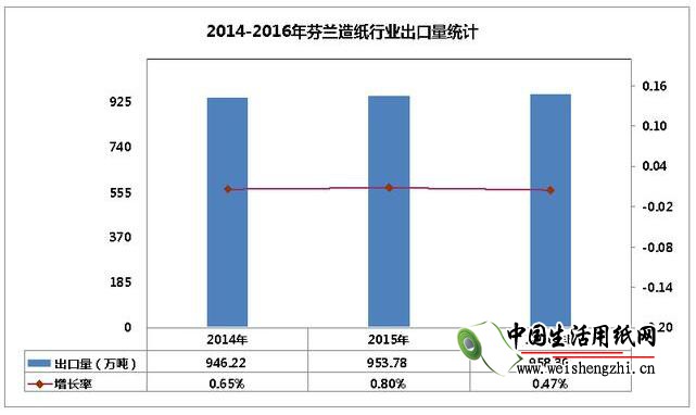 2014年芬兰造纸行业纸及纸板出口量约946.22万吨,2015年约953.78万吨,2016年约958.3万吨。