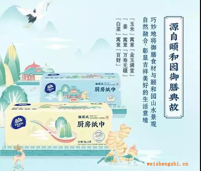 新款厨房纸巾厚实强韧,吸油吸水。产品包装采用日常的食材:比如白菜,生姜、玉米、莲藕、寿桃等形象,设计灵感源自颐和园御膳典故——“白菜”寓意“百财”,“玉米”寓意“金玉满堂”,“姜”寓意“万寿无疆”,“寿桃”寓意“健康长寿” ,巧妙地将御膳食材与颐和园山水自然景观完美融合。