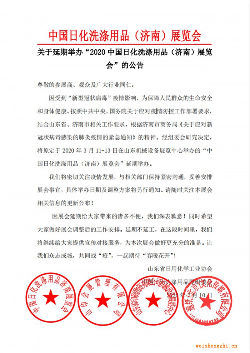关于“2020中国日化洗涤用品(济南)展览会延期举办”的通告