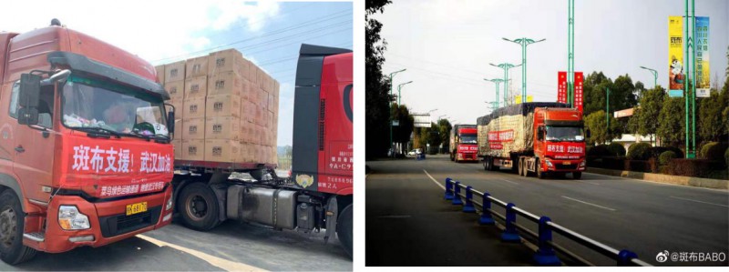 驶向武汉的车队,每一辆货车上的红色标语,满载着每一个斑布人的祝福! “斑布支援,武汉加油”、“英雄城市武汉,斑布等你凯旋归来“!