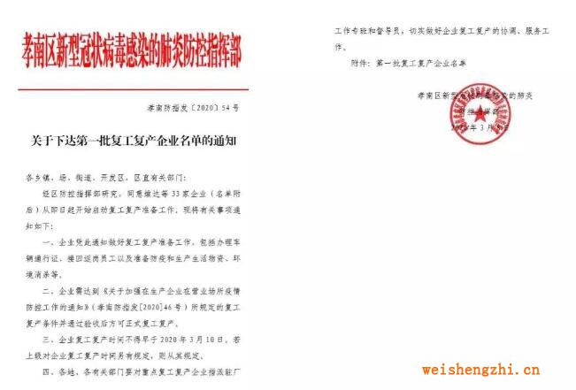 该通知表示,经区防控指挥部研究,同意维达等33家企业从即日起开始启动复工复产准备工作。