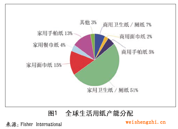 如图1所示,在所有生活用纸品类中,卫生纸(厕纸)产能大,占全球生活用纸总产能的58%,其中家用卫生纸占51%,商用/公共场所用卫生纸仅占7%。