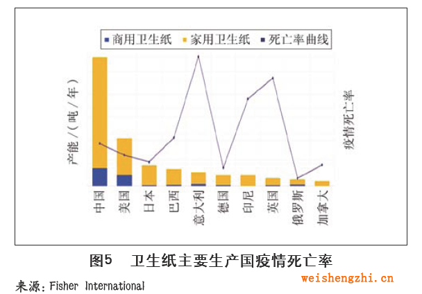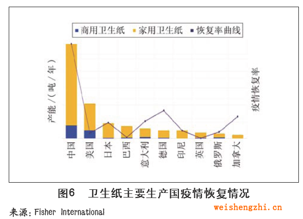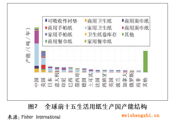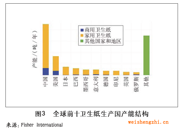 图2是全球主要生活用纸生产国的产能结构情况,显示中国和美国家用和商用卫生纸产量所占份额大。
