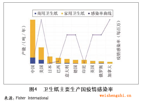 图3主要展示了全球主要国家的家用和商用卫生纸的生产情况,其中蓝色部分显示了每个国家的商用卫生纸份额,黄色部分是家用份额。考虑到疫情因素,商用部分是需要减少的份额。由图3可以看出,中国和美国的商用卫生纸份额较大,需要减少的商用产能也多,意大利排名第三。