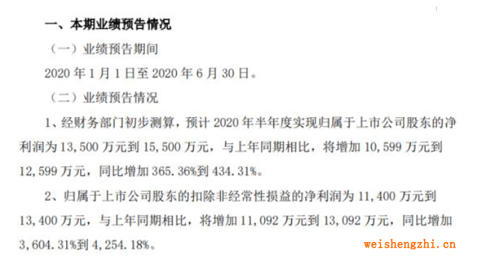 公告显示,业绩预告期间为2020年1月1日至2020年6月30日,归属于上市公司股东的扣除非经常性损益的净利润为11,400万元到13,400万元,与上年同期相比,将增加11,092万元到13,092万元,同比增加3,604.31%到4,254.18%。
