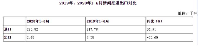 进出口方面,海关数据显示,2020年1-6月新闻纸进口293.82千吨,同比2019年上半年增加34.91%。1-6月累计出口量2.45千吨,同比2019年1-6月减少43.65%。出口量寥寥,对市场影响不大,进口量增加较多,利空国内市场。