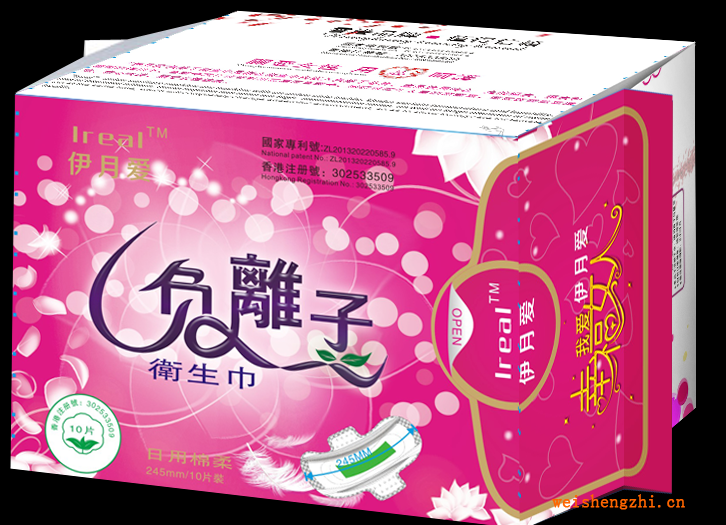 “伊月爱”负离子卫生巾是指在卫生巾内钳入负离子芯片,产品使用时在一定的温度、湿度和摩擦的作用下,负离子芯片可发射出高浓度的负离子,用纯物理的过程达到了抗菌、消炎和除异味等功效,对女性生理健康产生积极的作用。