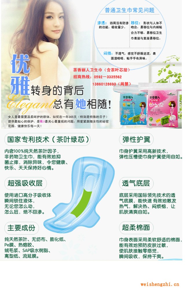 1、国家专利技术(茶叶绿芯)。内含100%纯天然茶叶因子,非药物卫生巾,能有效抑菌止痒,消除异味,令女性朋友健康、快乐、天天保持好心情。