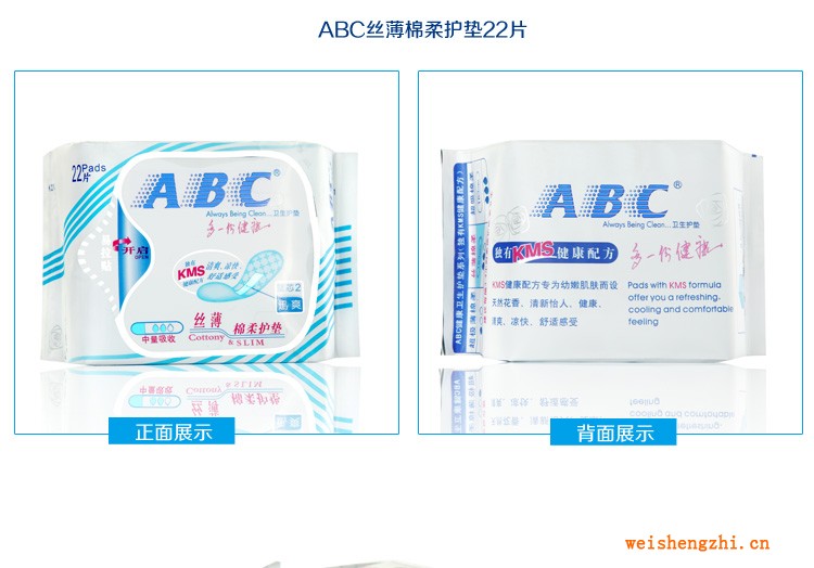 | 包装形式:护垫 | 品牌:ABC | 保质期:2年 |