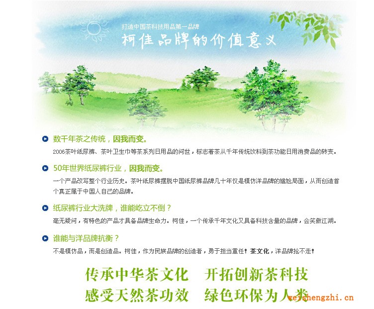 2008年,柯佳公司运用国际尖端科技萃取茶叶中的纯天然茶因子,研发了——具有全球唯一专利技术的——茶叶纸尿裤,为世人开创一种更健康、环保、舒适卫生的宝宝呵护方式。健康型茶叶纸尿裤的大特点:消炎杀菌,专治红屁屁及过敏,告别尿臭味!