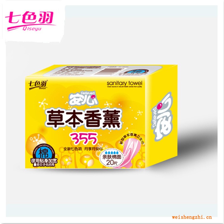 天津卫生巾生产厂家|整箱批发|七色羽安心草本香薰355卫生巾