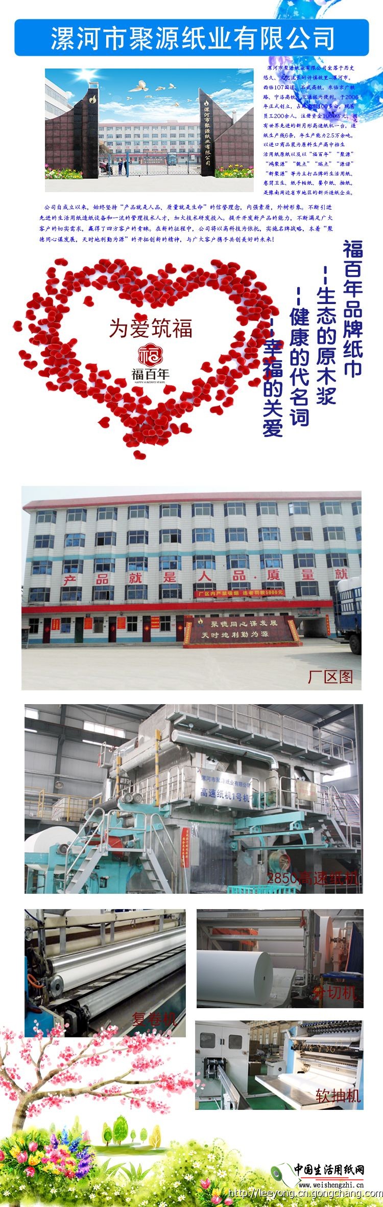 聚源纸业有限公司坐落于历史悠远、文化流长的许慎故里漯河市,西临107国道、石武高铁,东临京广铁路,宁洛高速,交通极为便利。于2006年正式创立,占地100余亩,现有员工200余人,注册资金1000万元,拥有造纸生产线4条,年生产能力2.5万余吨。主要生产、销售高档卫生用纸原纸、擦手纸原纸,以及以“聚源”、“金聚源”、“鸿聚源”、“靓点”、“福百年”等为主打品牌的卷筒卫生纸,手帕纸,抽纸。是豫南地区新兴的造纸企业。